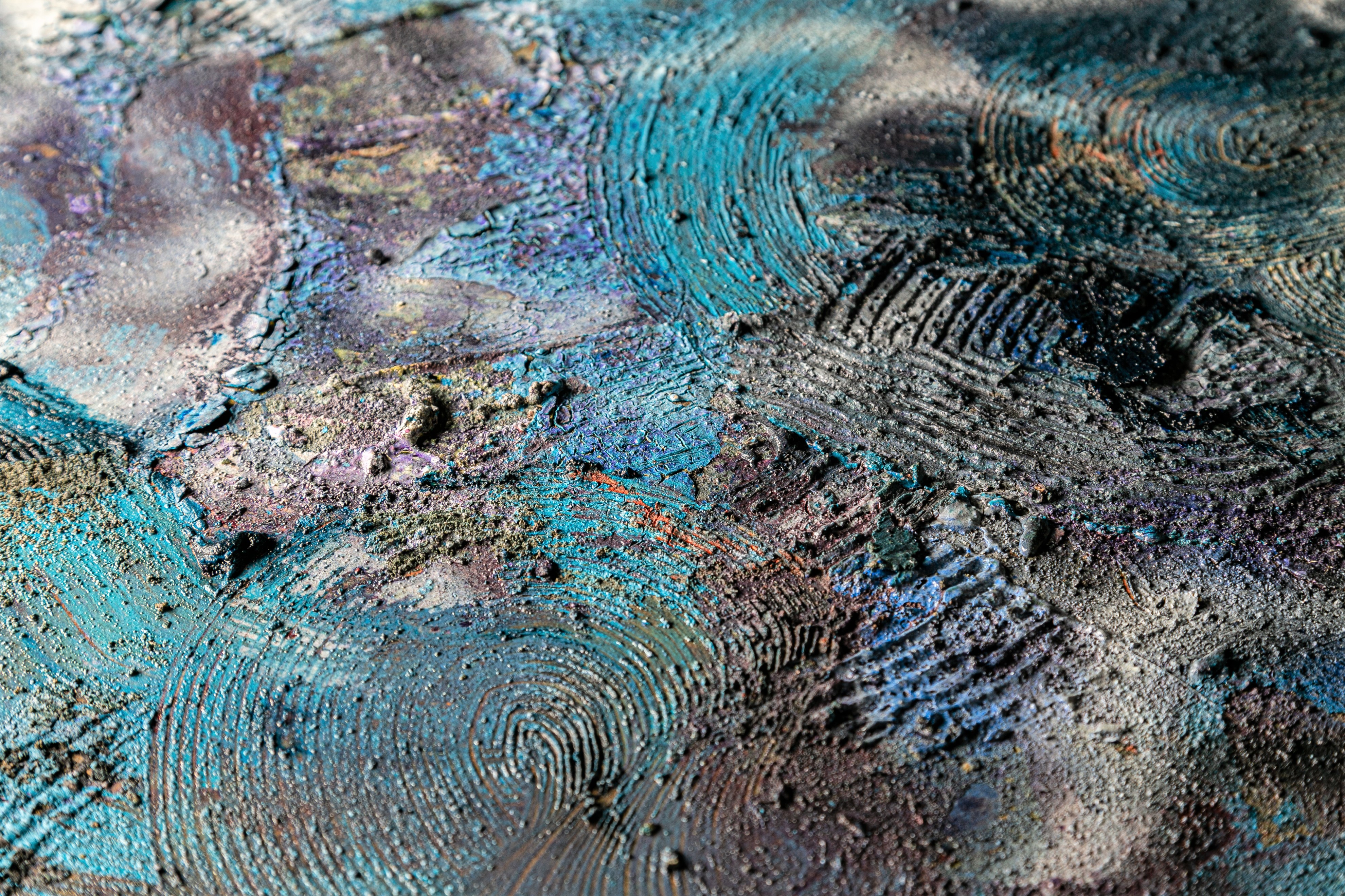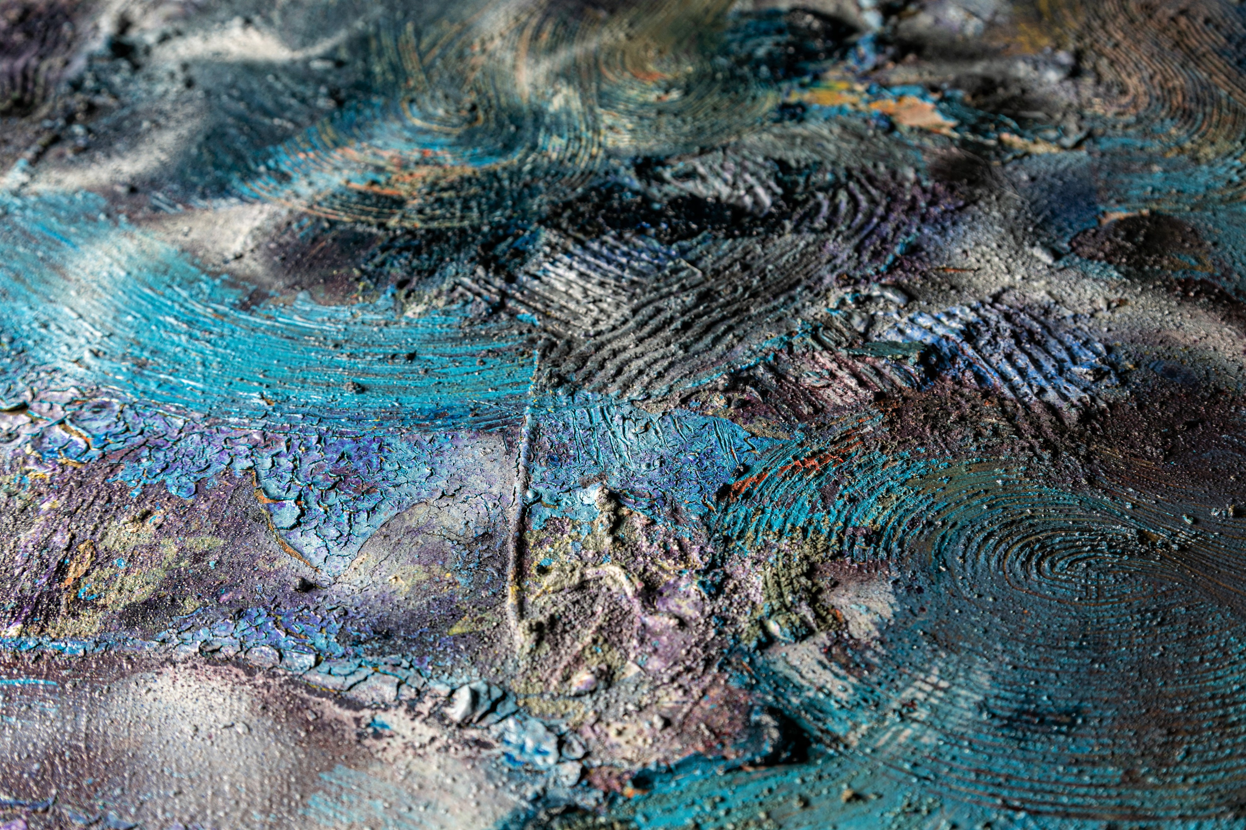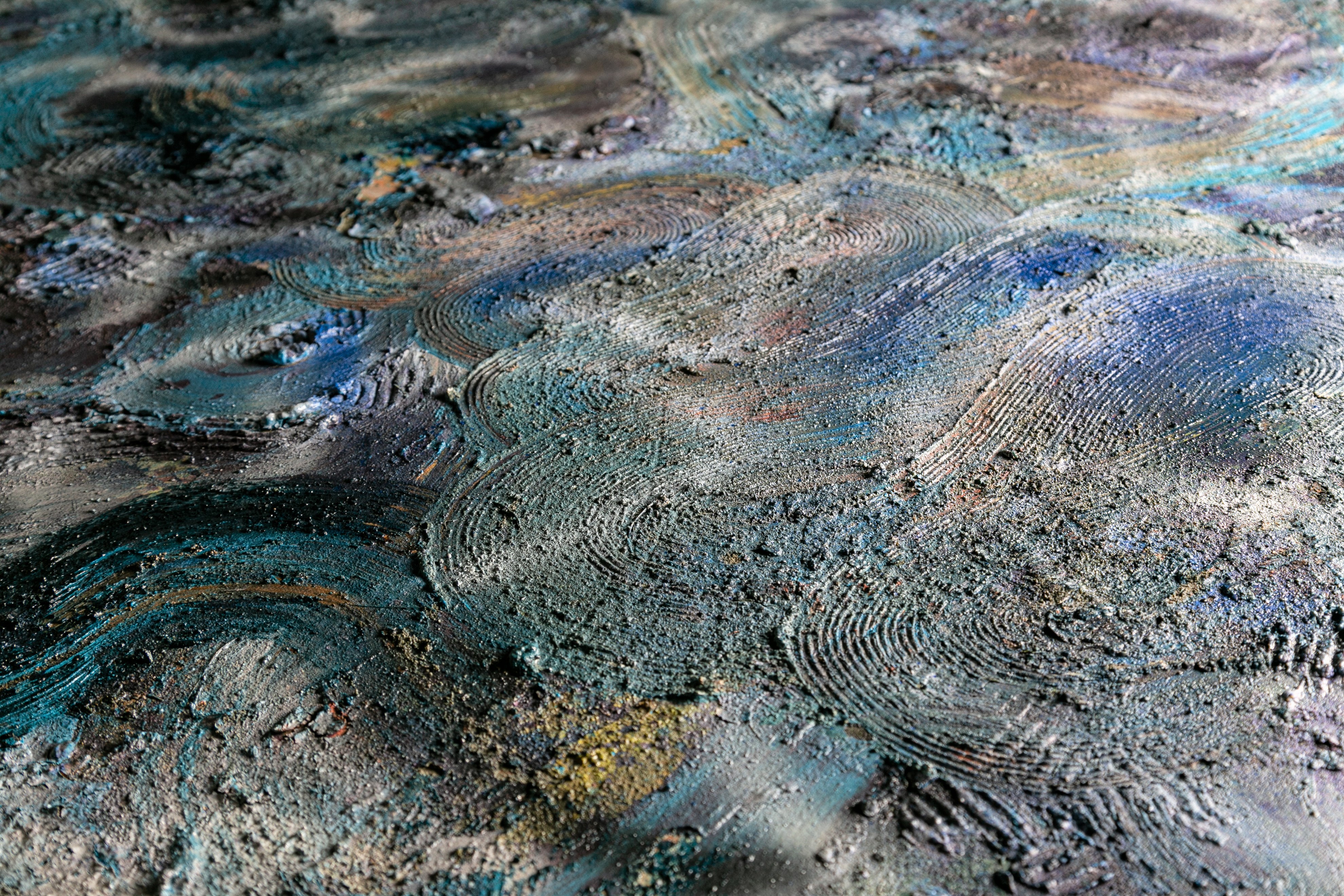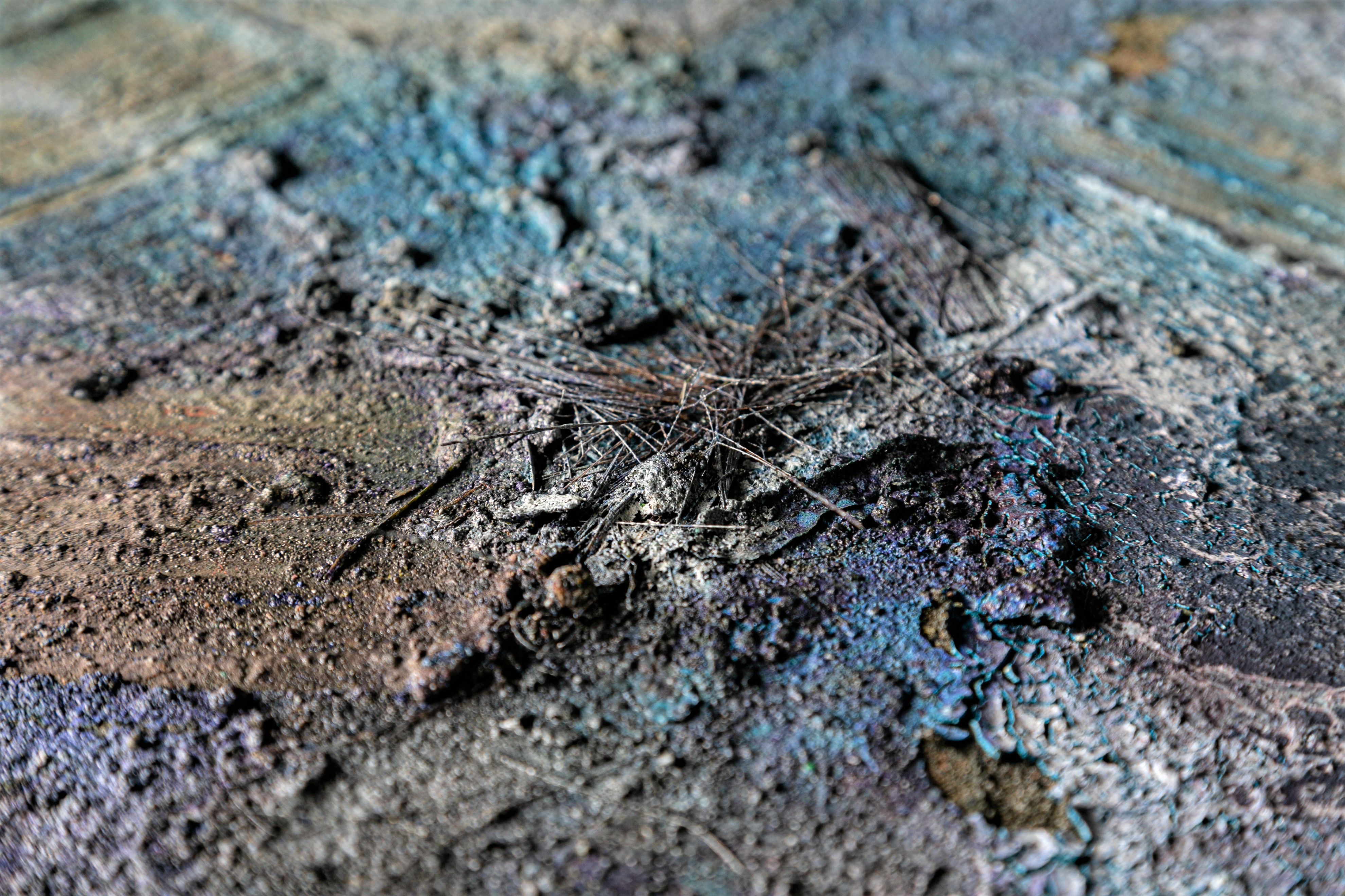 or She played with her hair while I sat at the bottom of the pool. Clay, dirt, concrete, natural sand, synthetic and natural hair, acrylic, oil, aerosol, damar, gamvar. 48" x 48" Available