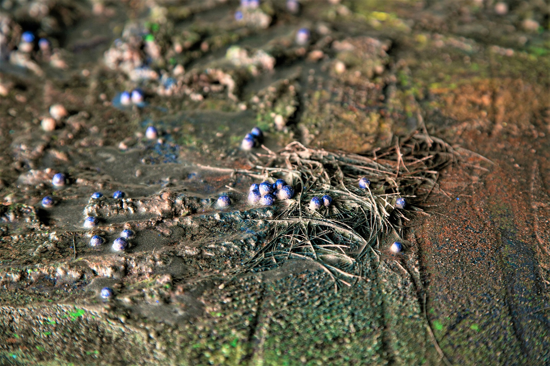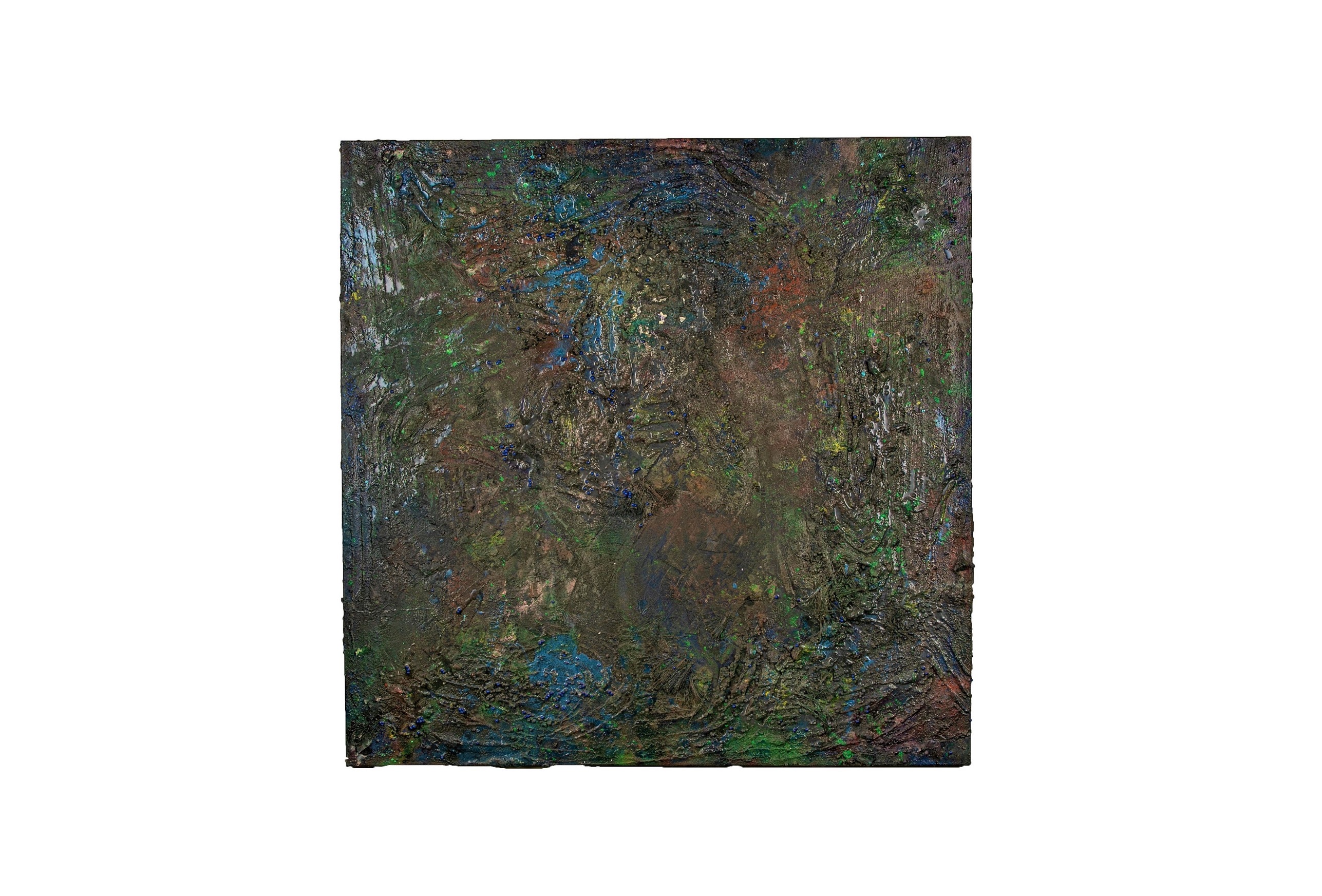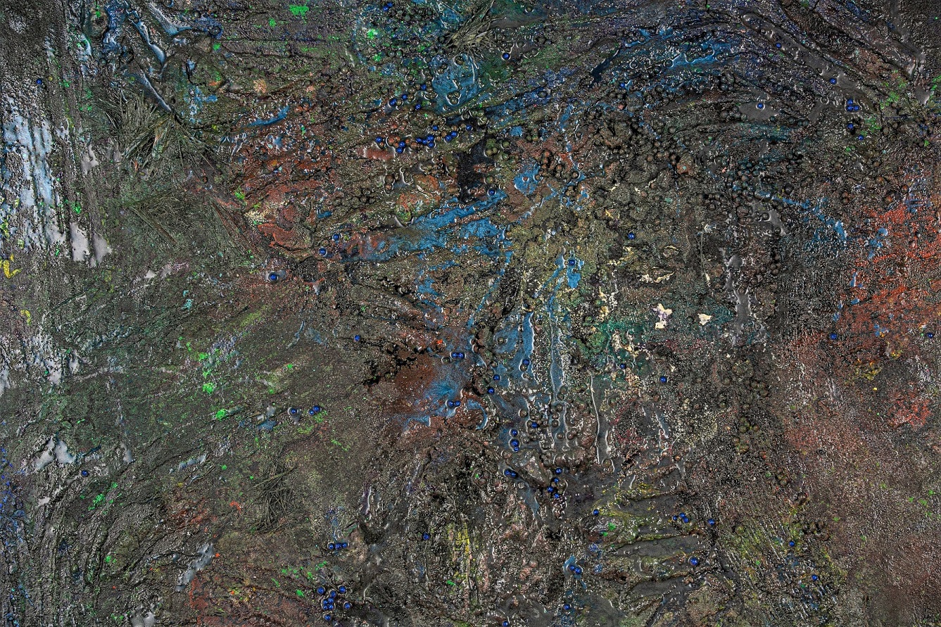 Made from plastic foam balls, pulverized iron (ii,iii) oxide, wood ash, recycled paintbrush fibres, natural charcoal, concrete, salt, epoxy resin, oil, acrylic, damar, uv archival spray.