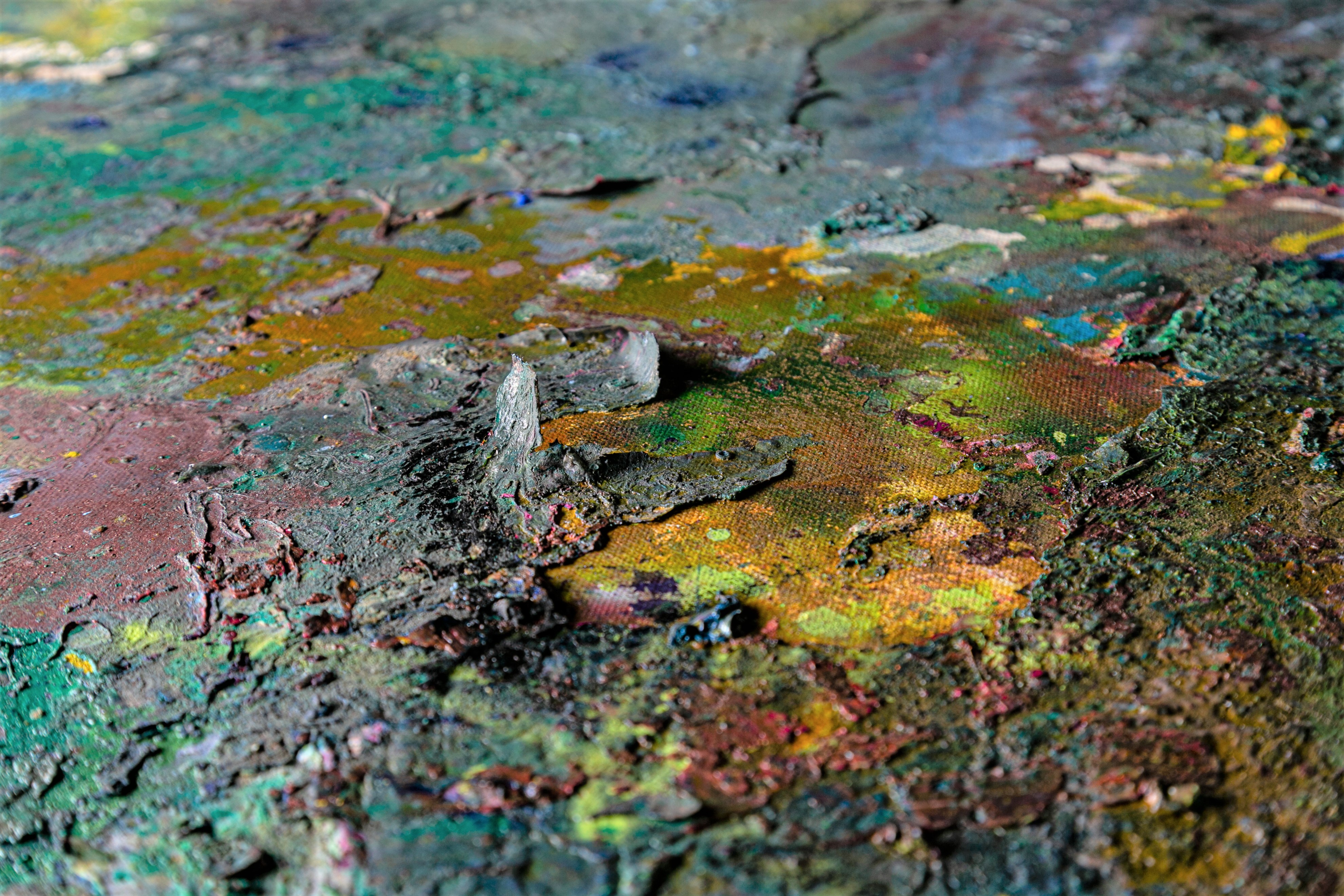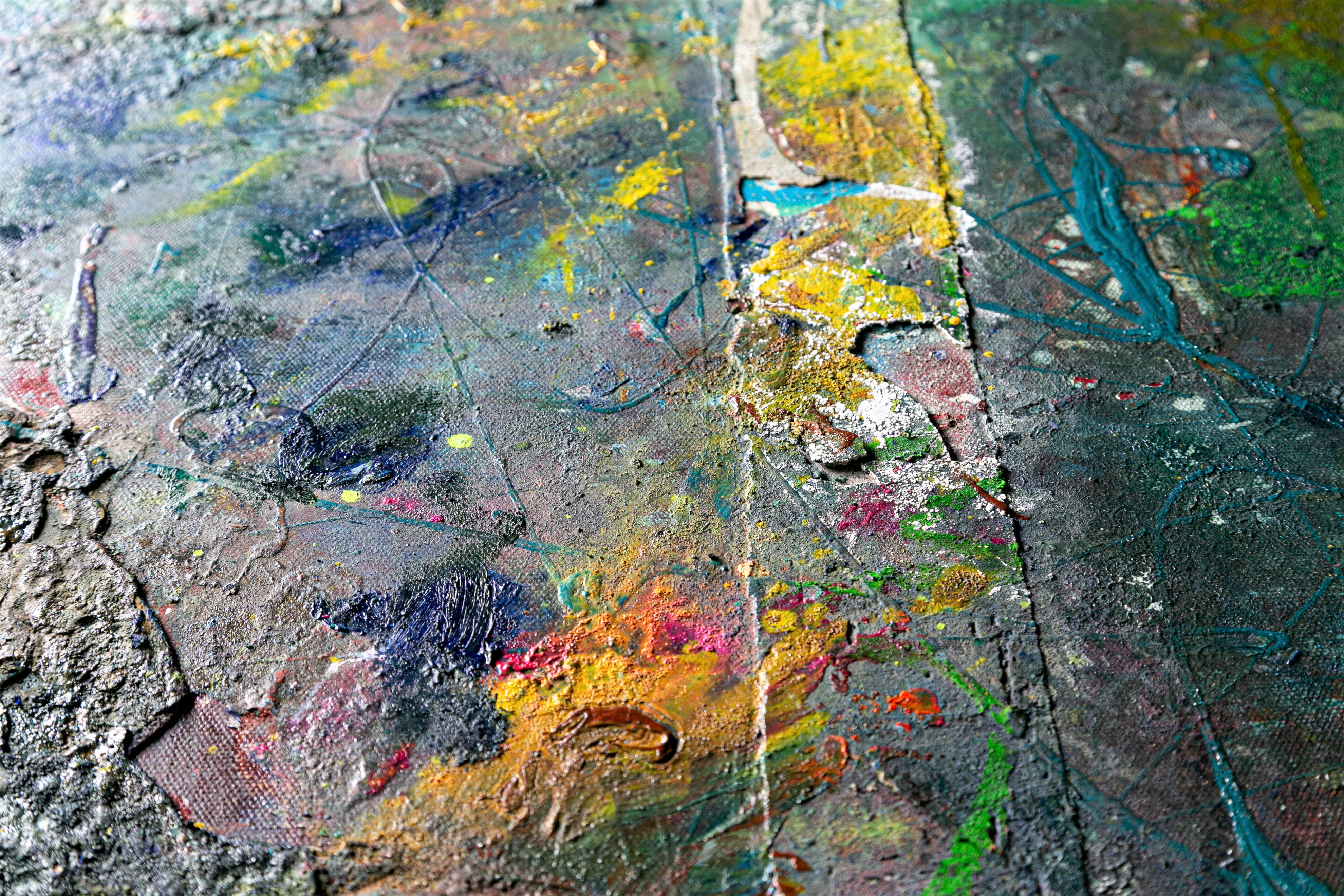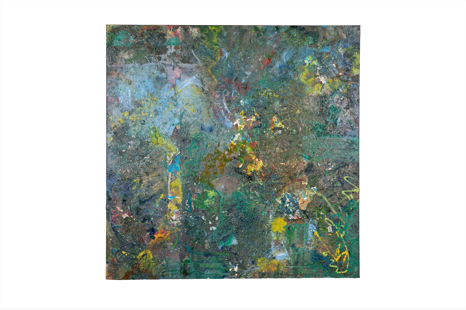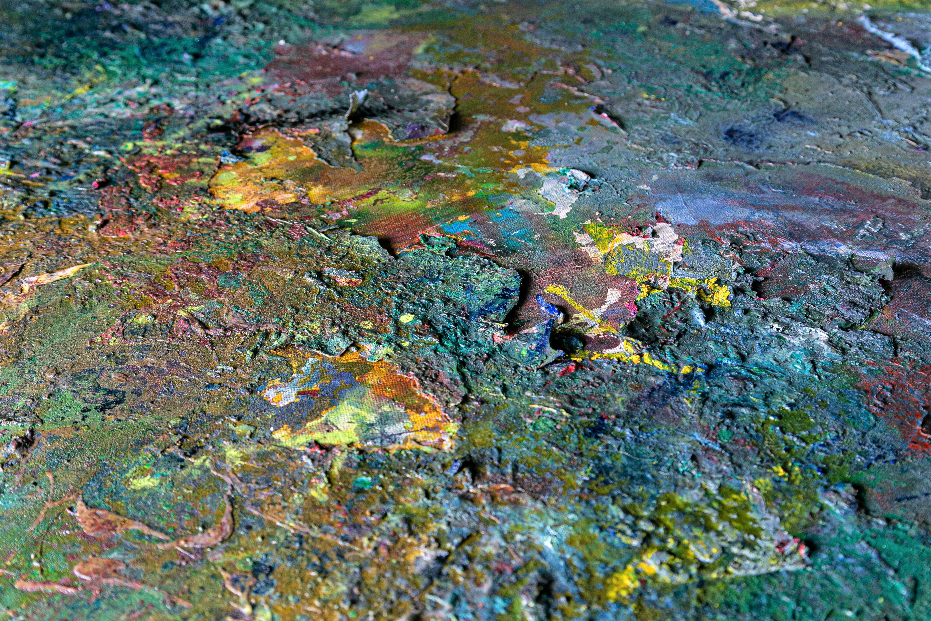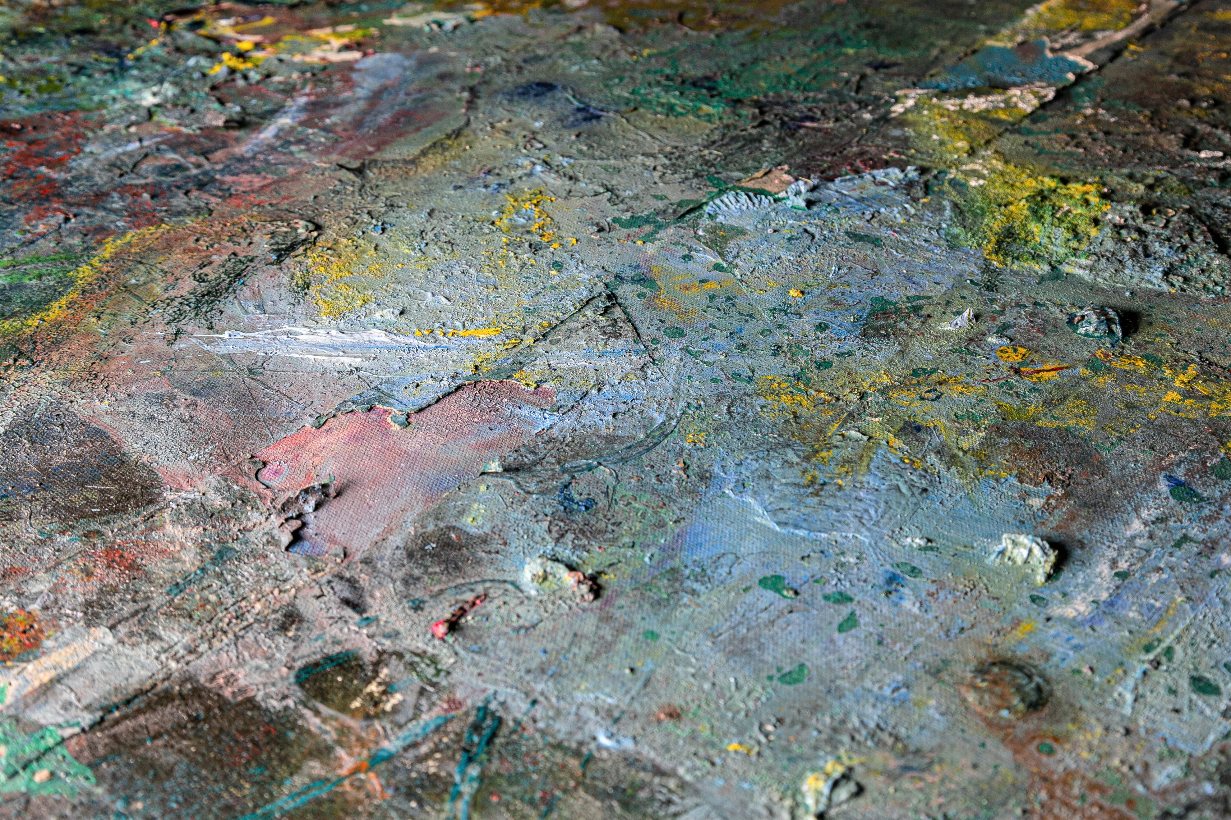 Dirt, gravel, forest debris, gel markers, finger paints, children’s paints, utility paint, pigment, acrylic paint skins, concrete, drywall compound, acrylic, oil, damar.
